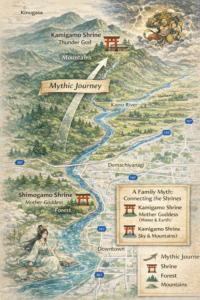 Shimogamo Shrine and Kamigamo Shrine are places where you can experience a myth by walking. Seeing these two shrines as a story of parent and child gods may not be widely known. If you walk with this story in mind, the scenery of Kyoto may feel different. When you visit Kyoto, try walking from Shimogamo Shrine to Kamigamo Shrine, following the Kamo River upstream. You may begin to see how the landscape unfolds like a story.